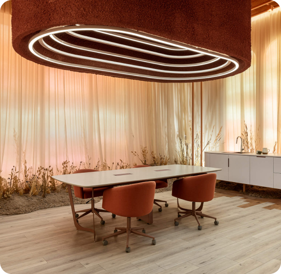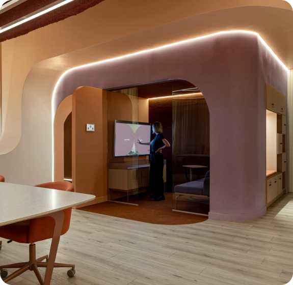 El espacio se centra en la fluidez y adaptabilidad de los lugares que habitamos, reflejando una era de límites cambiantes y diluidos acelerados por las nuevas tecnologías, cambios en las formas de comunicarnos y las nuevas modalidades de trabajo. Por ello, el diseño se articula alrededor de tres ejes principales: la virtualidad, la flexibilidad y la sostenibilidad.