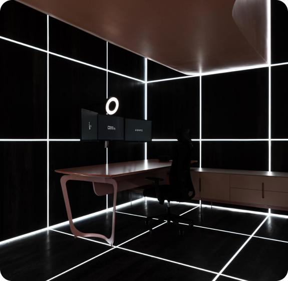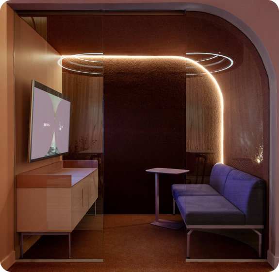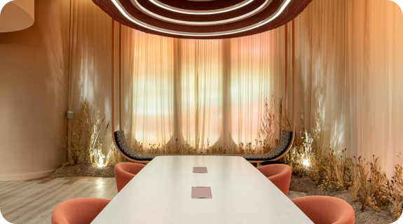 El espacio se centra en la fluidez y adaptabilidad de los lugares que habitamos, reflejando una era de límites cambiantes y diluidos acelerados por las nuevas tecnologías, cambios en las formas de comunicarnos y las nuevas modalidades de trabajo. Por ello, el diseño se articula alrededor de tres ejes principales: la virtualidad, la flexibilidad y la sostenibilidad.